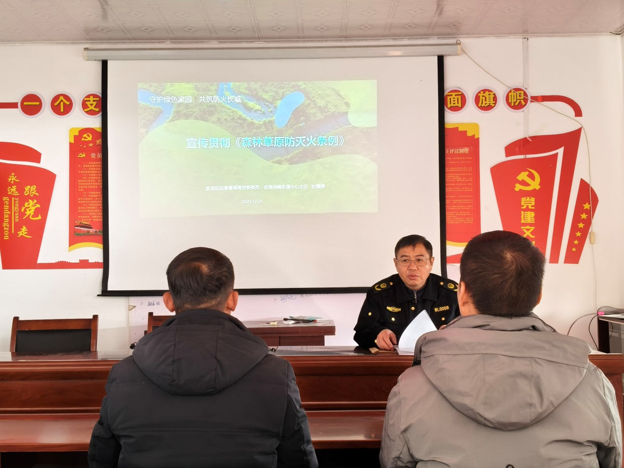 12月中旬,区安防办率先走进龙王沟风景区刘老庄村,巧妙借助主题党日活动这一重要平台,开展《森林防灭火条例》专题宣传贯彻活动。区应急救援保障中心负责人凭借深厚的专业知识和丰富的实践经验,围绕《条例》的出台背景、核心要义以及重点条款,进行细致入微的解读。同时结合典型案例,深入剖析当前森林防火所面临的严峻形势与诸多挑战。“这次讲解让我思路豁然开朗、方向更加明确,也掌握了不少实用的防控方法。回去后,我们一定会立即行动起来,将责任精准落实到每一片山林、每一户人家。” 刘老庄村党支部书记朱金刚在听完宣讲后深有感触地说。